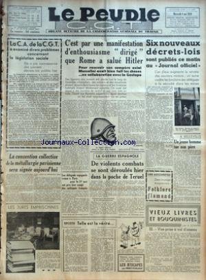 PDF PEUPLE C.G.T. (LE) [No 6311] du 04/05/1938 - LA C. A. DE LA C. G. T. - A EXAMINE DIVERS PROBLEMES CONCERNANT LA LEGISLATION SOCIALE - ELLE A PRIS CONNAISSANCE DES PREMIERS DECRETS-LOIS PUBLIES HIER - LA CONVENTION COLLECTIVE DE LA METALLURGIE PARISIENNE SERA SIGNEE AUJOURD'HUI - LES JURES EMPRISONNES - C'EST PAR UNE MANIFESTATION D'ENTHOUSIASME DIRIGE QUE ROME A SALUE HITLER - POUR RECEVOIR SON COMPERE AXIAL MUSSOLINI AVAIT BIEN FAIT LES CHOSES EN COLLABORATION AVEC LA GESTAPO - LES DELEGUES ES ePub